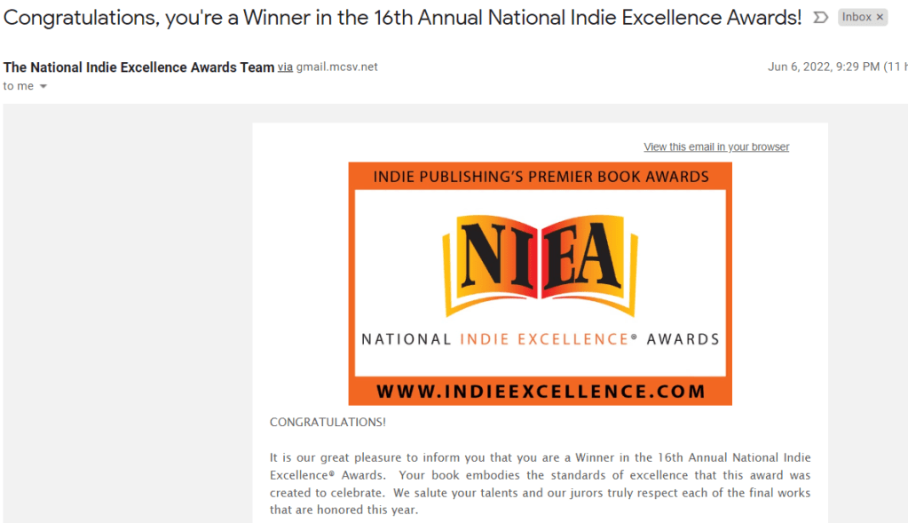 I am almost beyond words. My debut novel has been selected by the National Indie Excellence Awards panelists for the 2021-22 Best New Fiction prize. Click here (you’ll have to scroll down a bit).